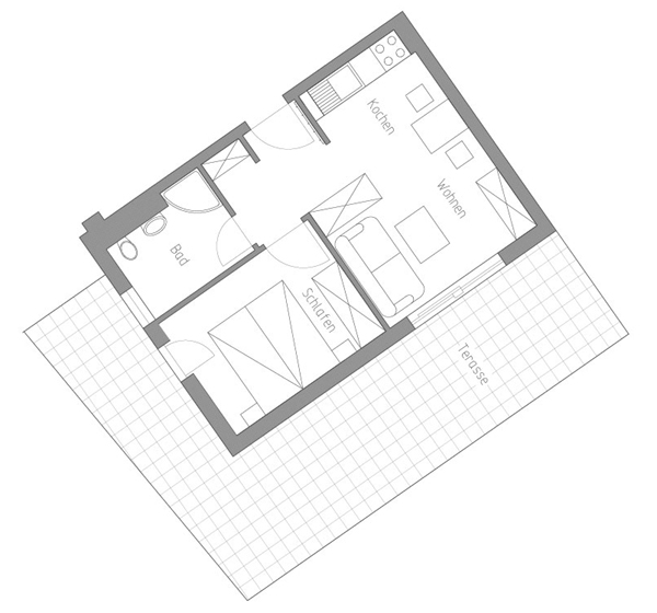 Wohnfläche 2 Personen (1 x Doppelbett + 1 x Schlafcouch) 32 qm